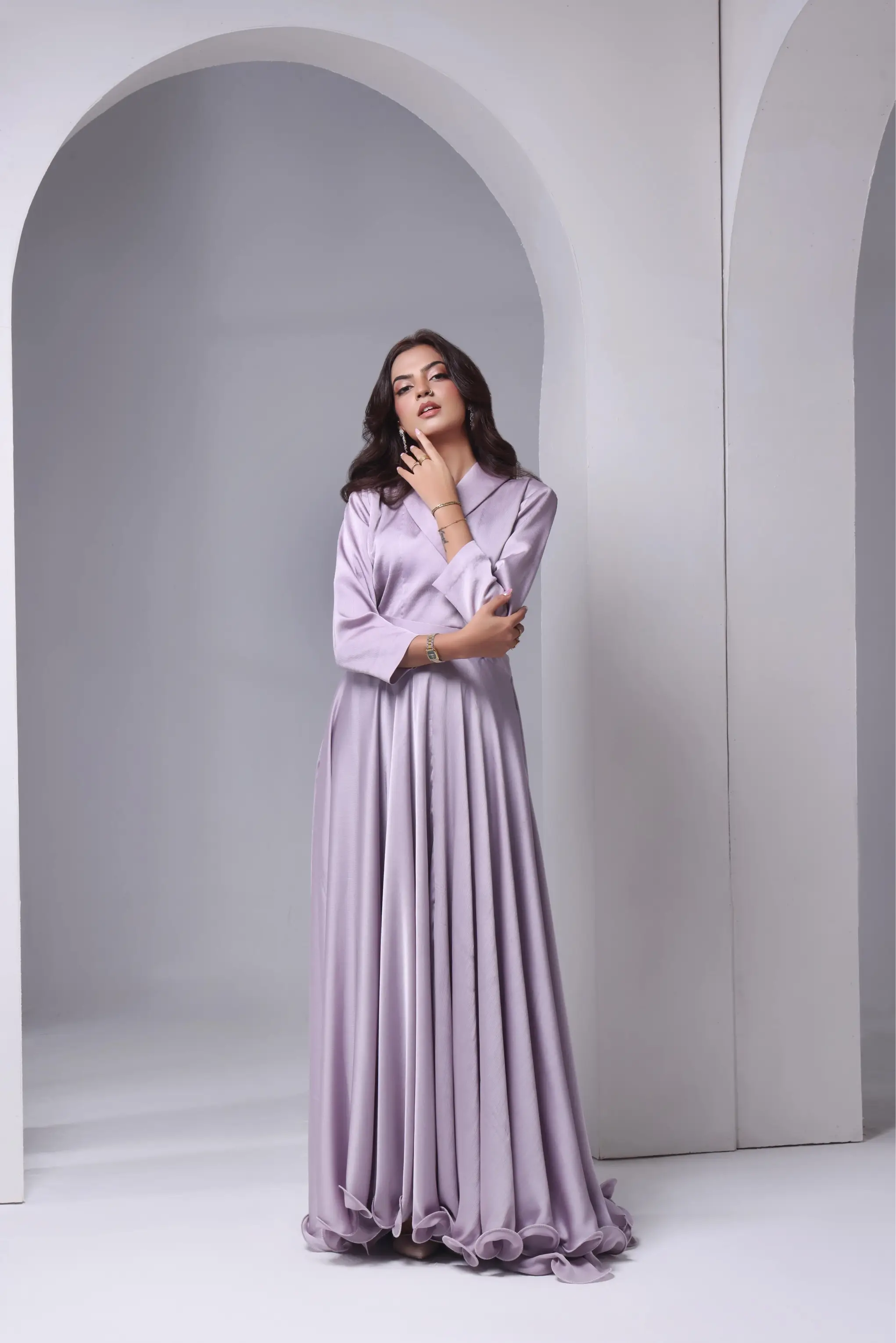 Your reign begins in softness and silk. The lilac Reign maxi dress drapes the body in a cloud of pale. It’s a sensory delight: cool to the touch, luminous to the eye.