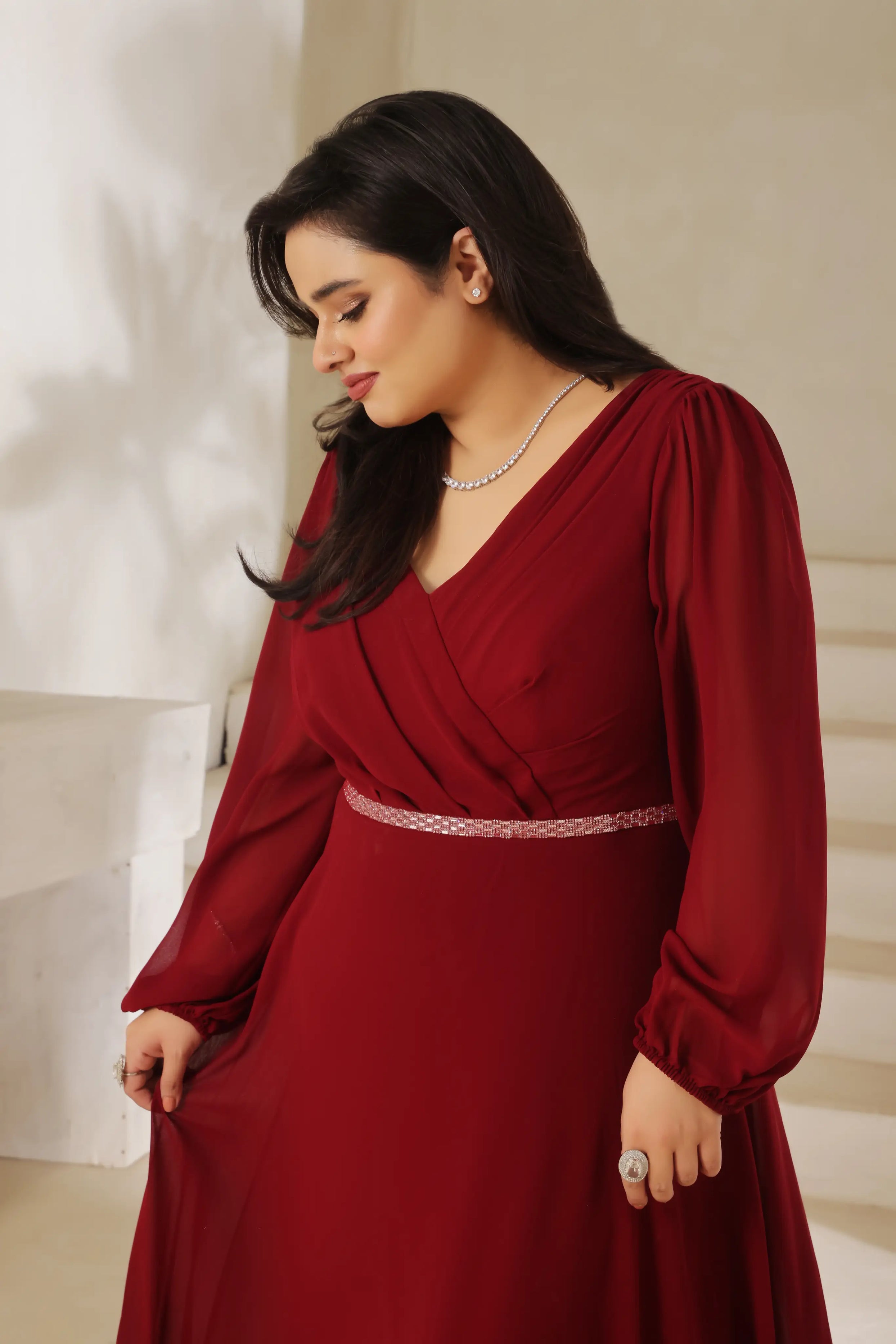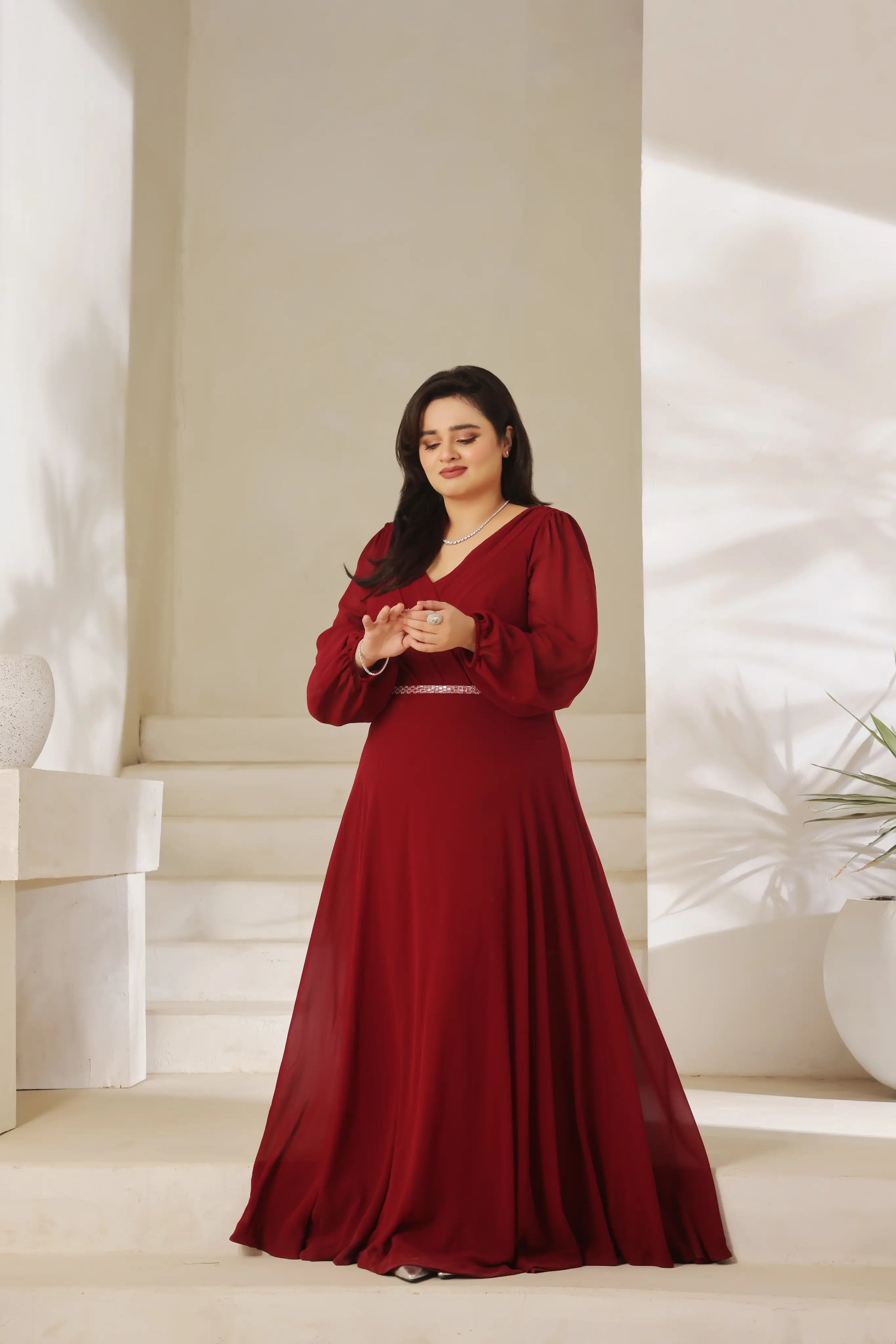 The delicate chiffon fabric floats around the silhouette, creating a soft ethereal effect. The rich red tone adds a warm energy to the dress inherently grace and feminine flow.