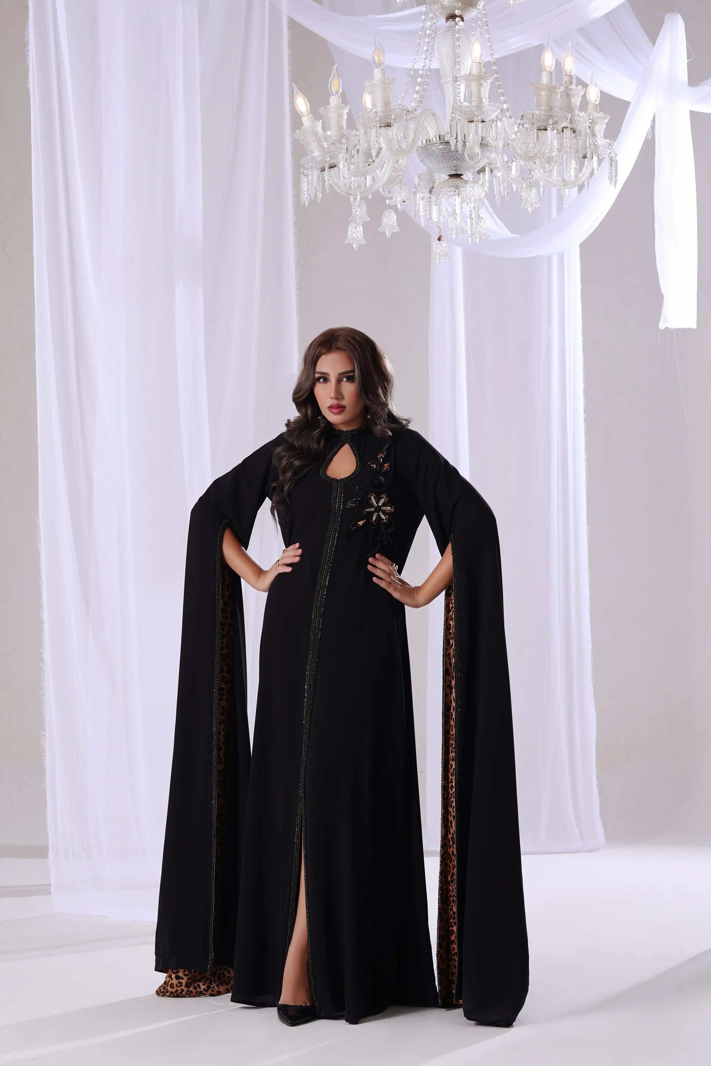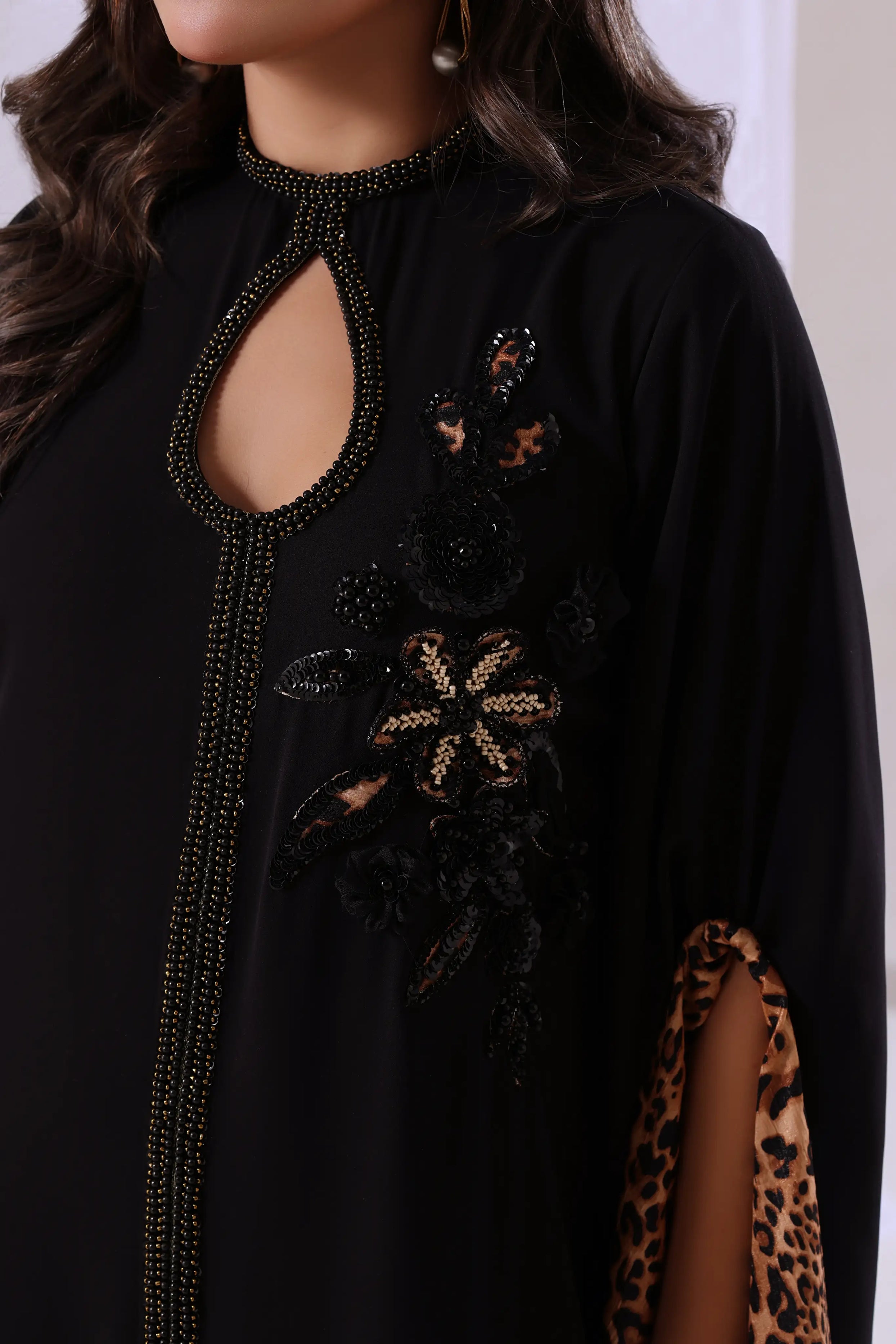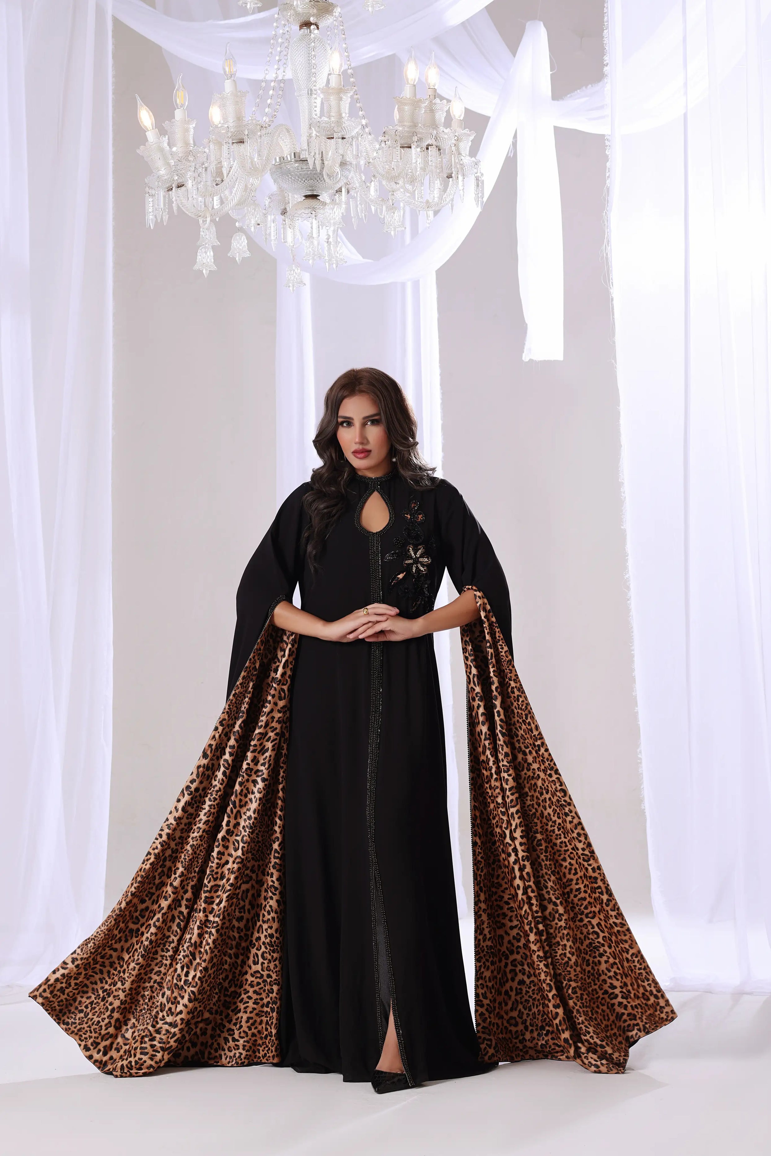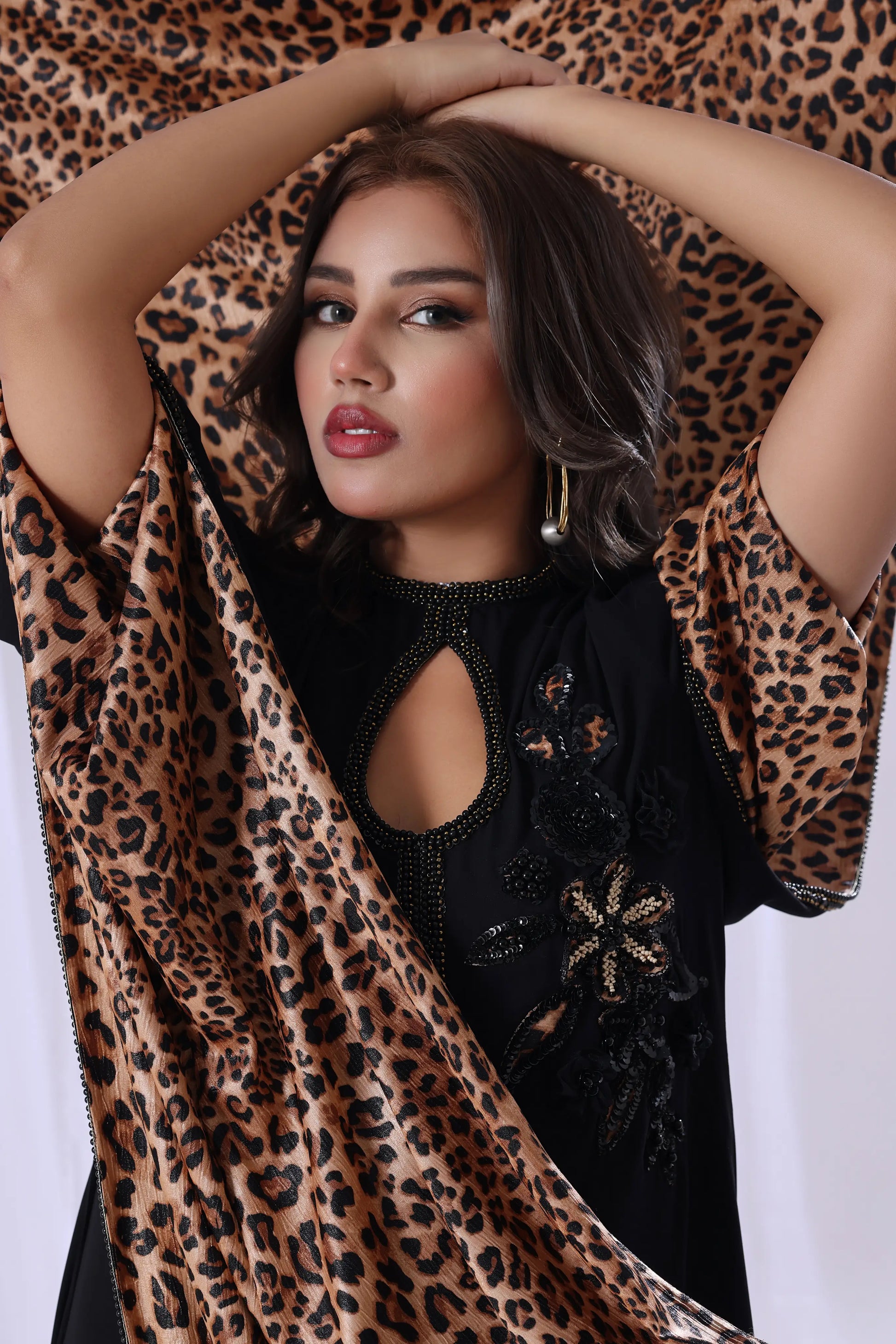 Full length Arabic Gown inspired by Middle Eastern culture. Features a dramatic silhouette with open, cape style sleeves and a striking leopard print lining for bold contrast. Adorned with an ornate beaded collar and plunging keyhole neckline, intricate black and gold beadwork, and sequined floral embellishments on the bodice. The front opening is finished with matching continuous beading.