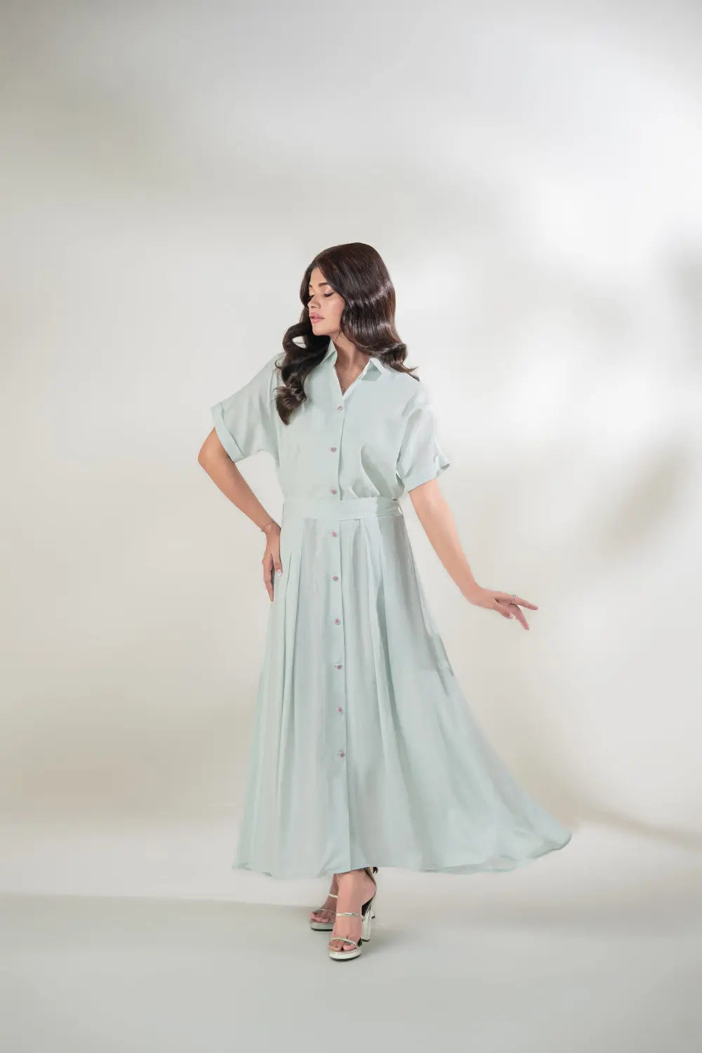 Embrace effortless elegance in 'The Meadow Shirt Dress.' Created from a lightweight, flowy fabric in a soothing pastel ice blue, this piece masterfully blends tailored details—like its button-front and collared neckline.
