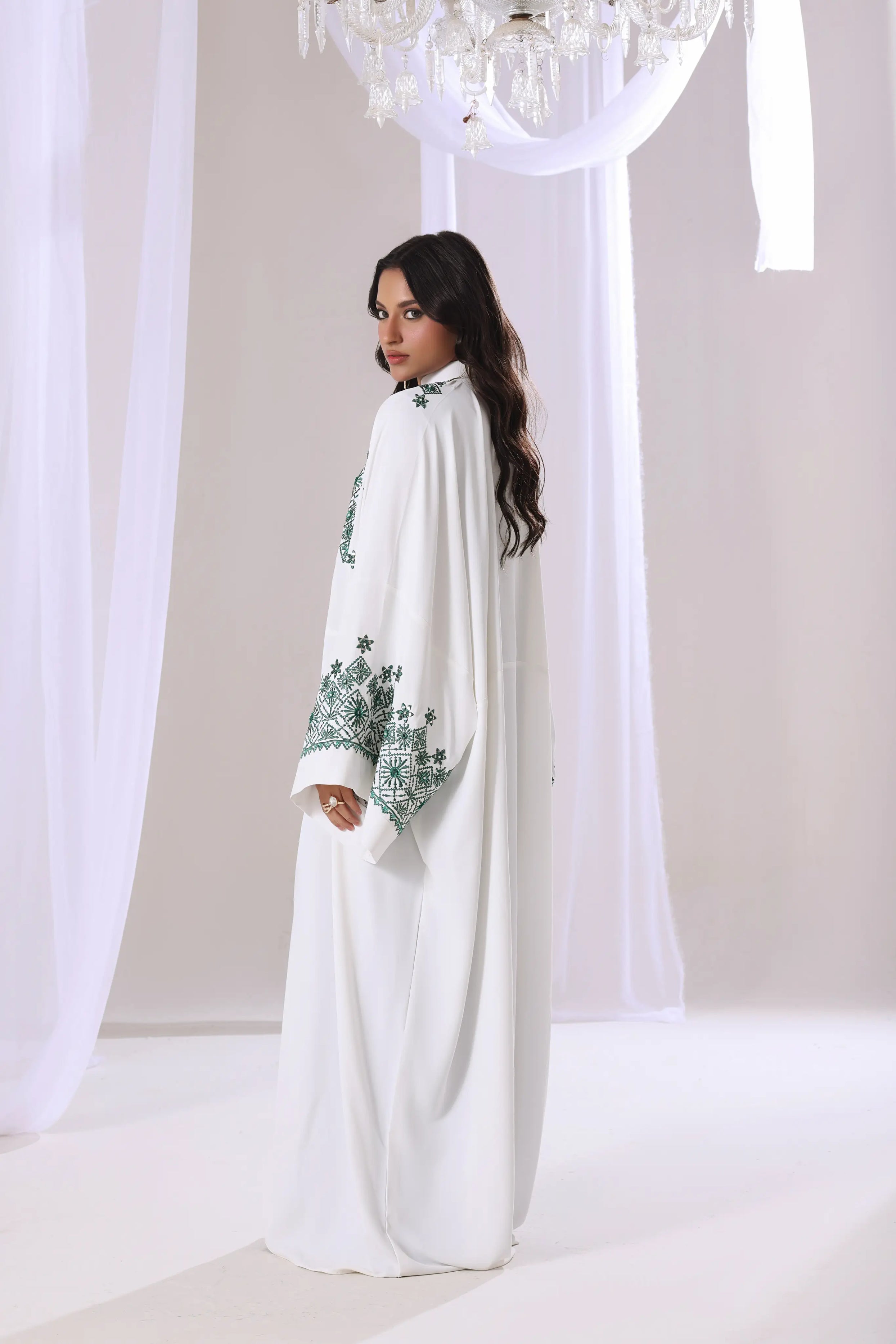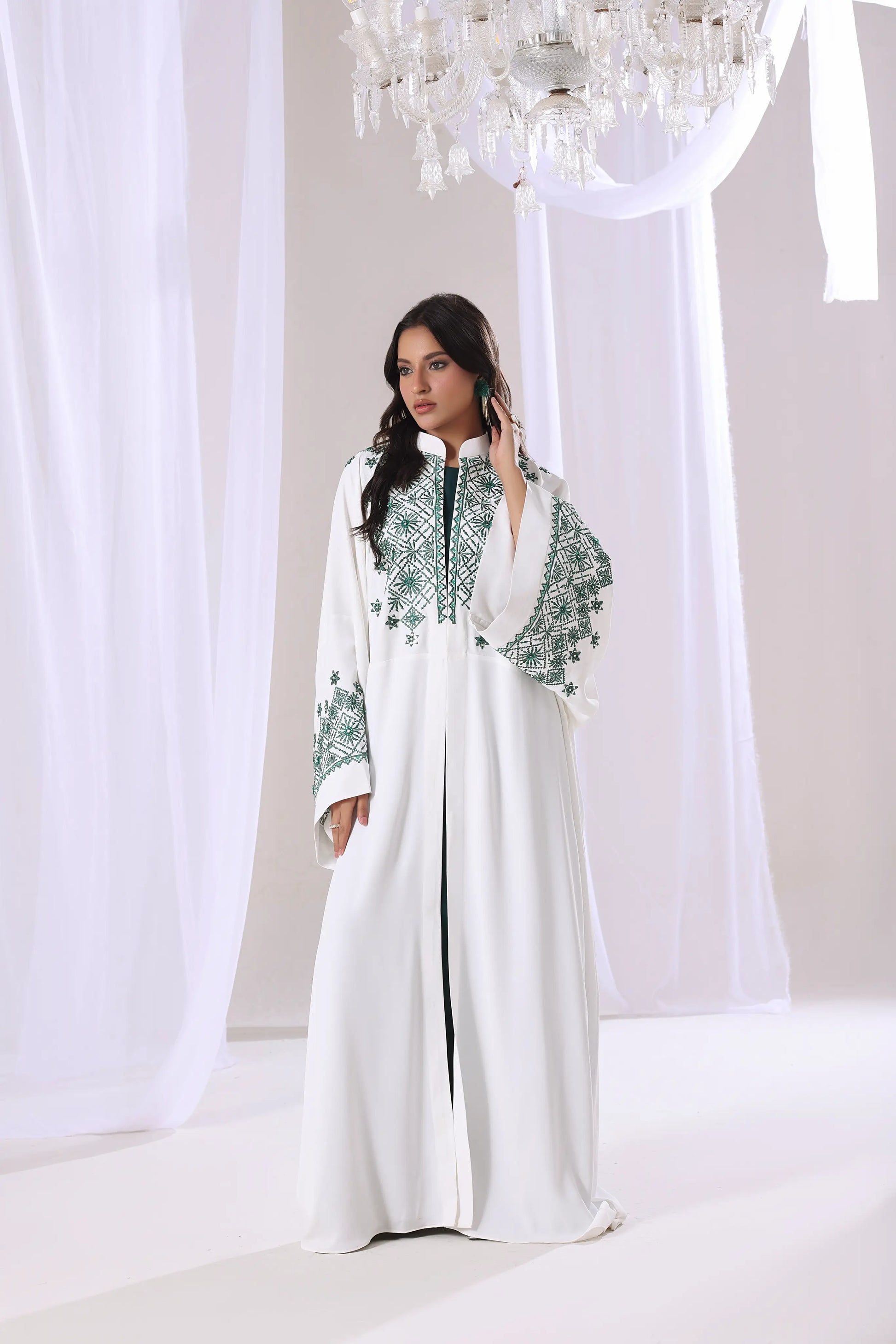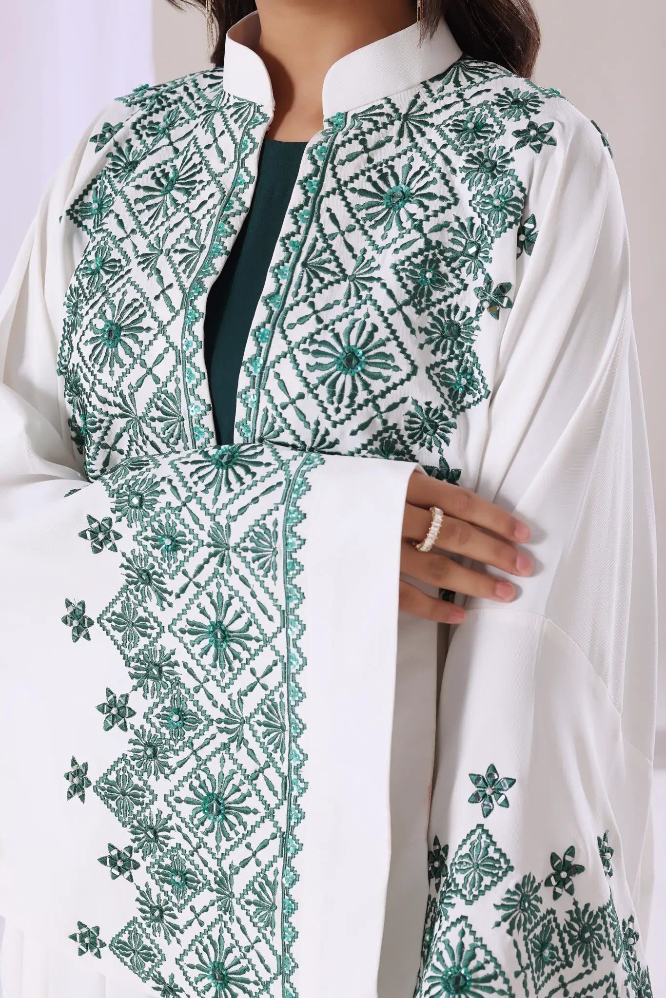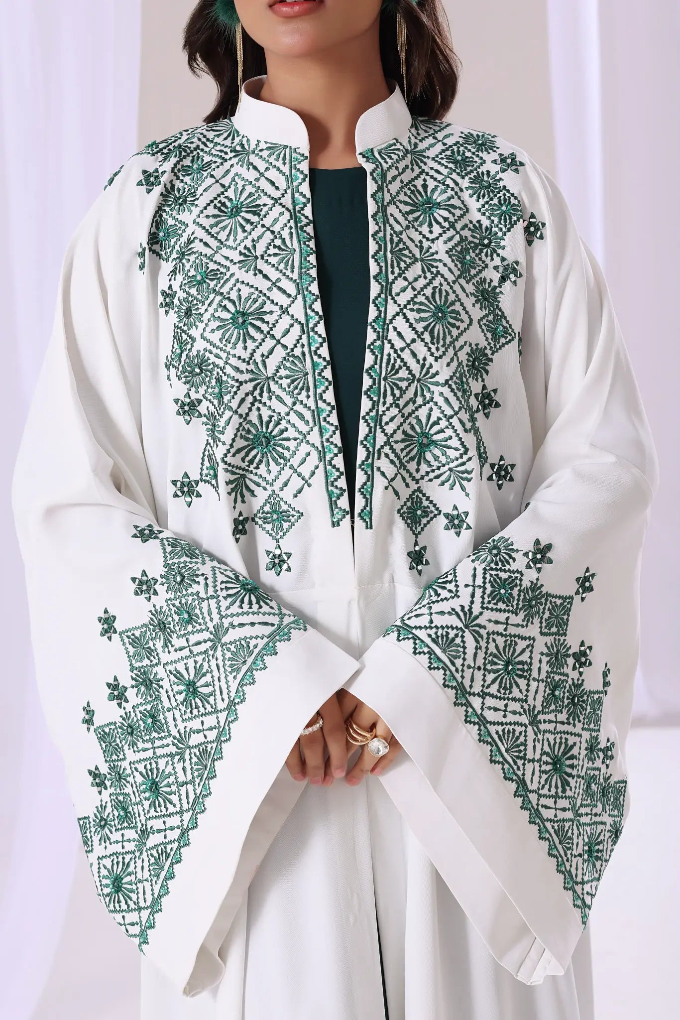 Full length, straight, open front Kaftan or Abaya with a relaxed, flowing silhouette and a stand-up collar. It features intricate emerald green geometric embroidery and subtle embellishments along the front lapels, neckline, and cuffs.
