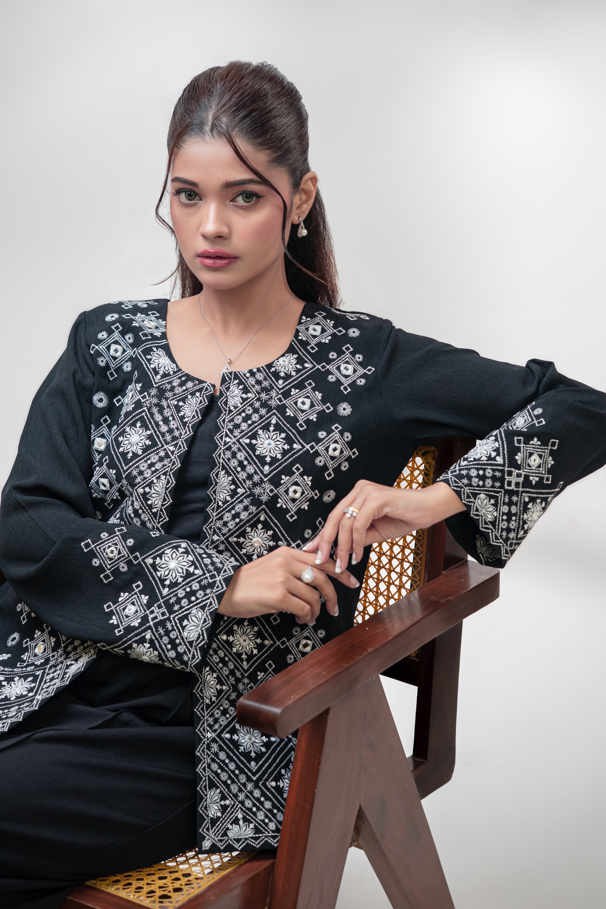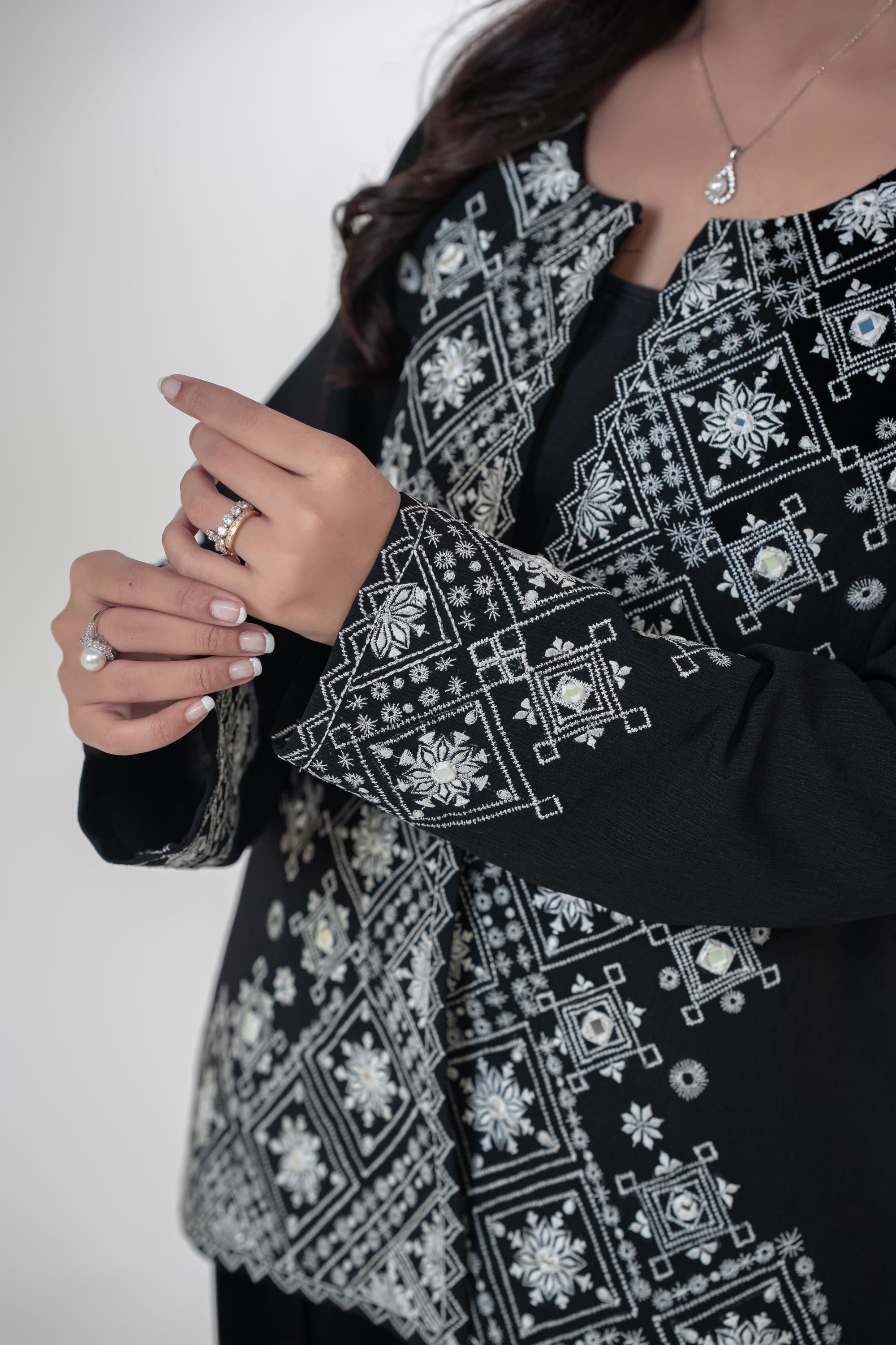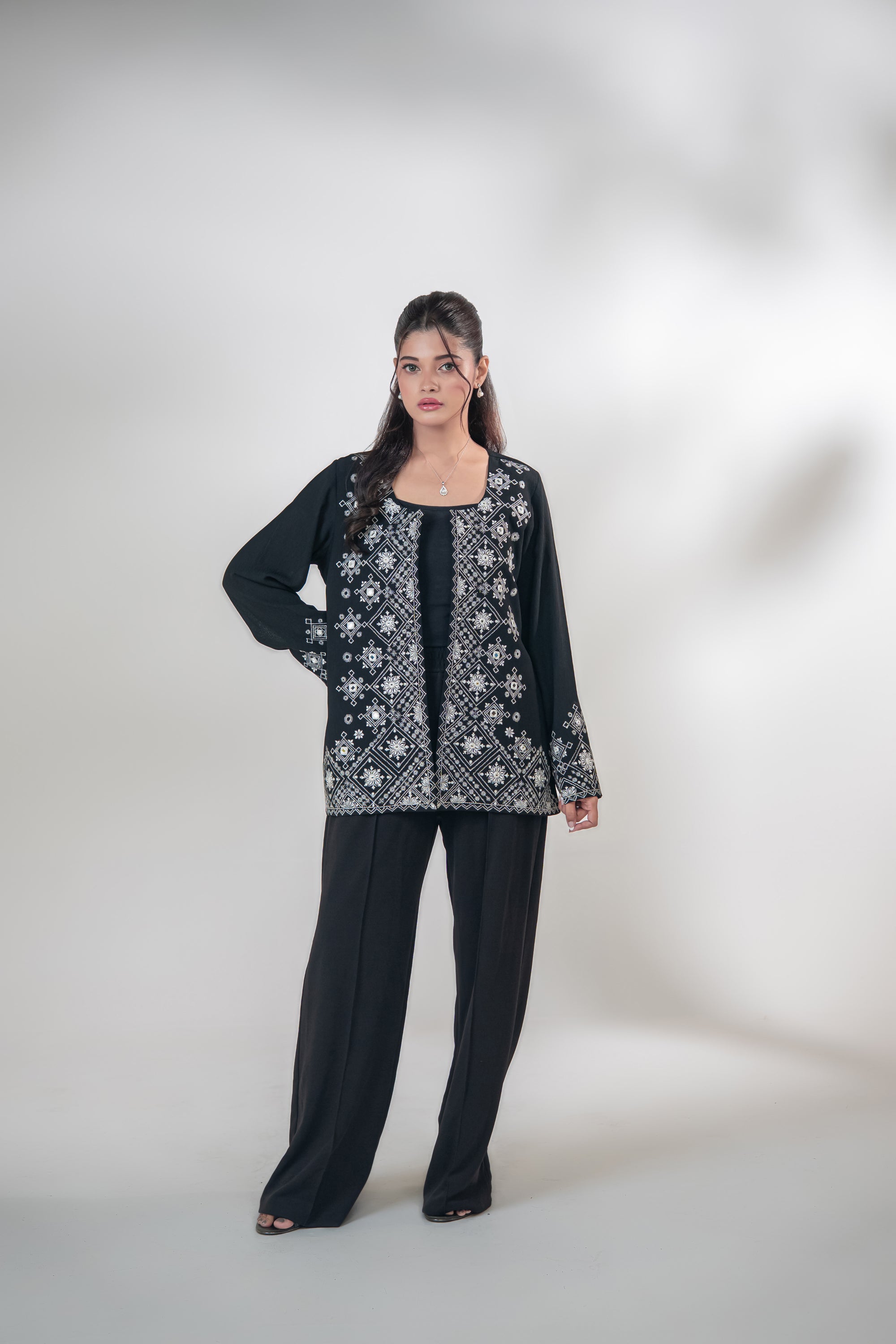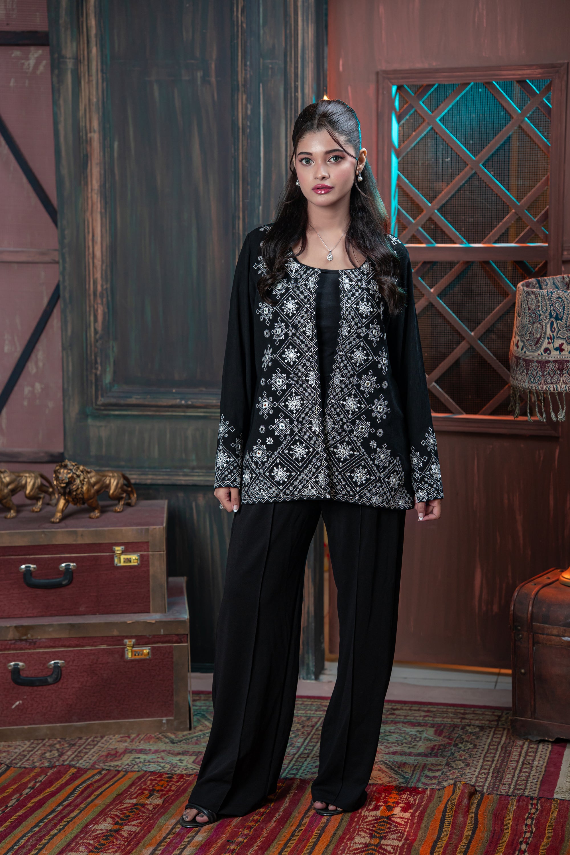 The Axiom in Starlight Mirror-Embroidered Fabric is a masterpiece of knit art, featuring a delicate black base transformed by intricate white embroidery. Thorough symmetrical frameworks—composed of squares and diamonds with tiny reflective mirrors scattered throughout to catch the light.