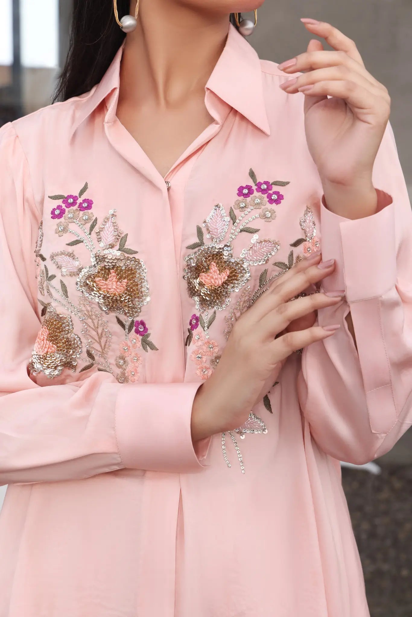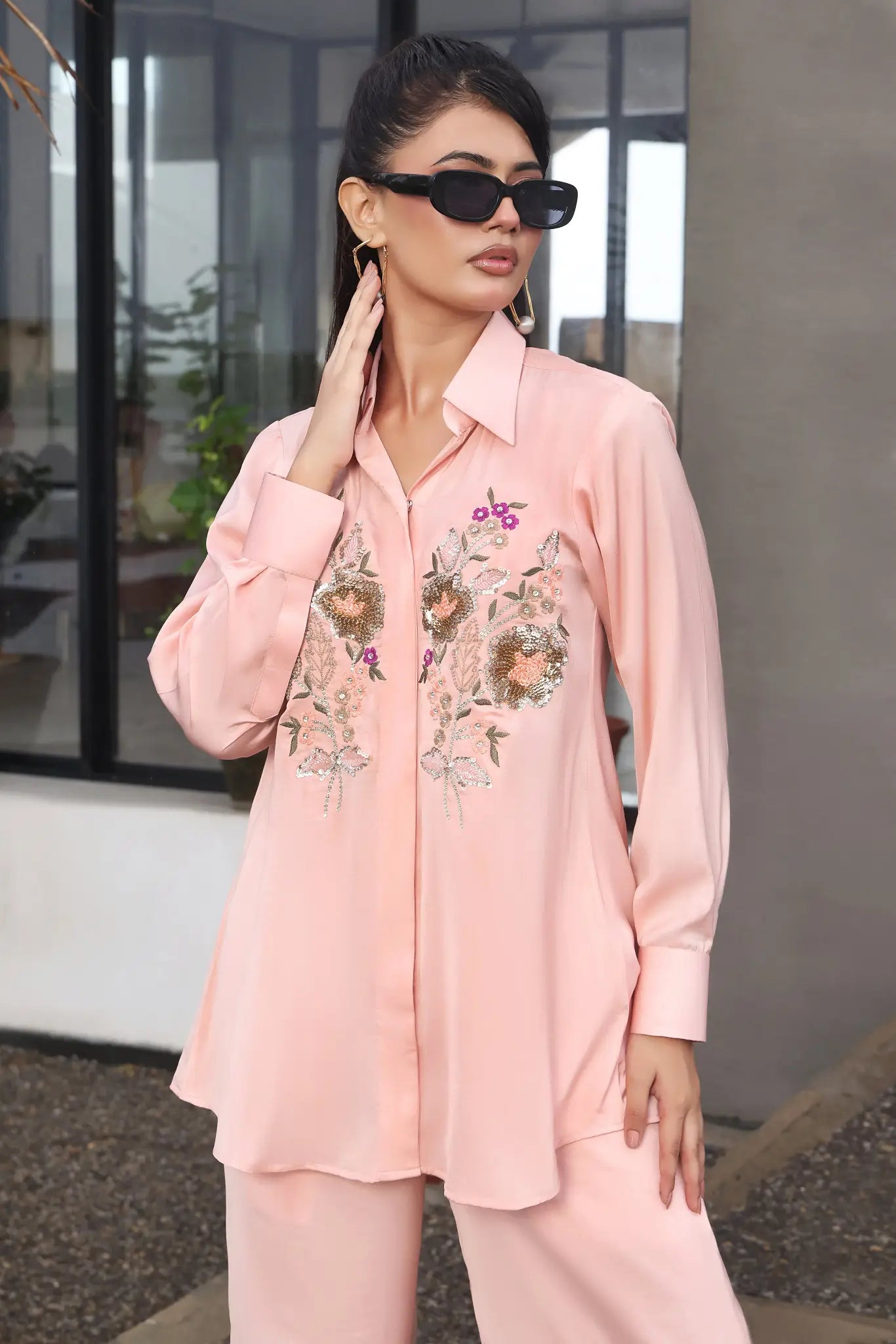 Step into a dream of delicate luxury with blushing beauty coord. This two-piece ensemble from silk offering an unparalleled feel of softness and a grace intricate floral embroidery blooms across the fabric.