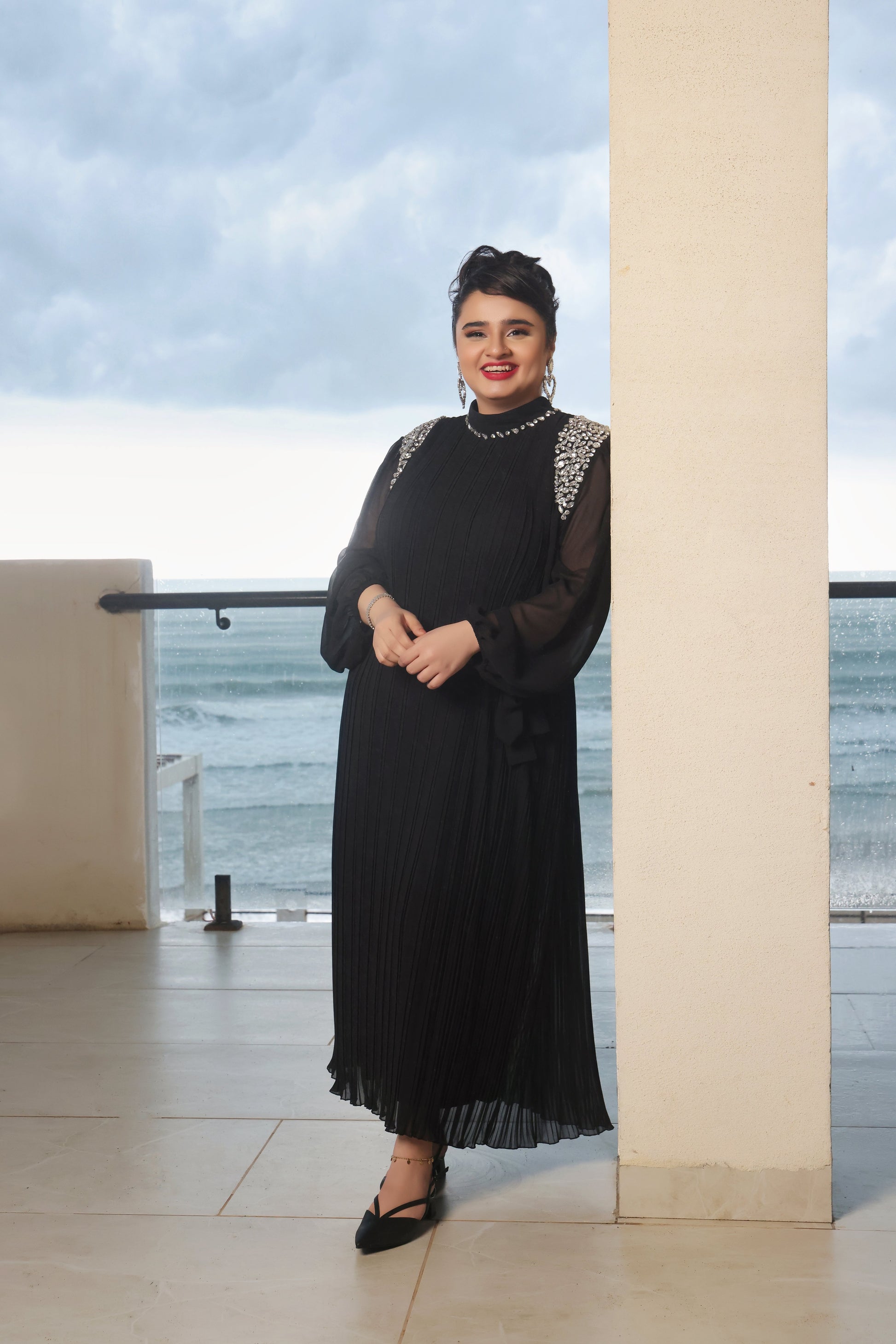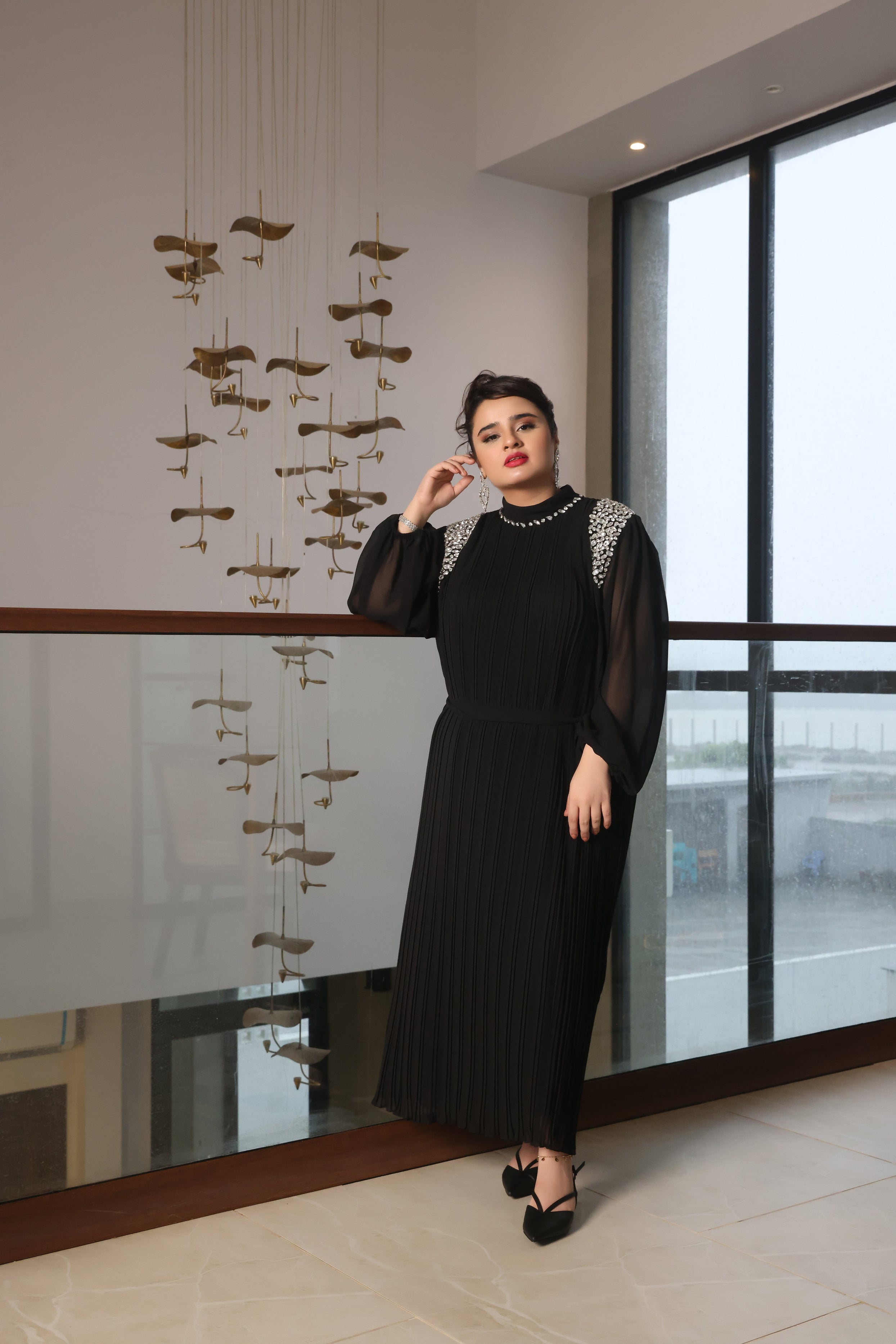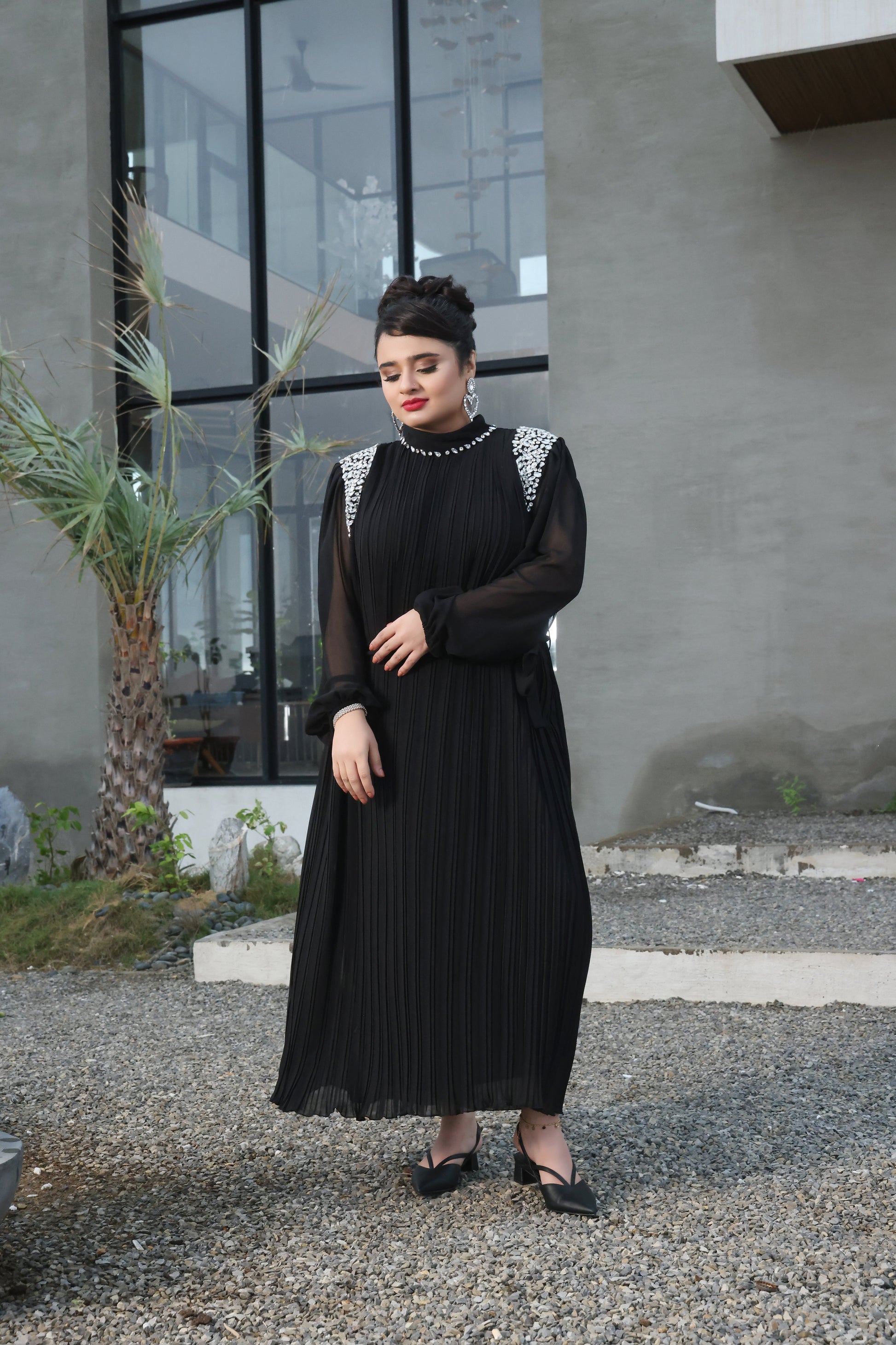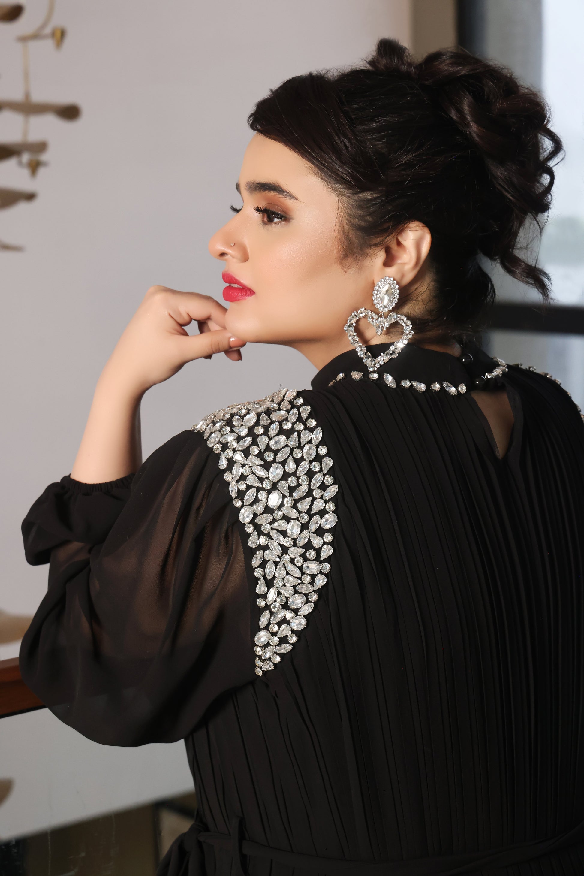 This Stunning dress is defined by its diamond mock neckline with enlisted with shimmering jewels. The black base creates a dramatic tactile backdrop that makes every gemstone sparkle even brighter.