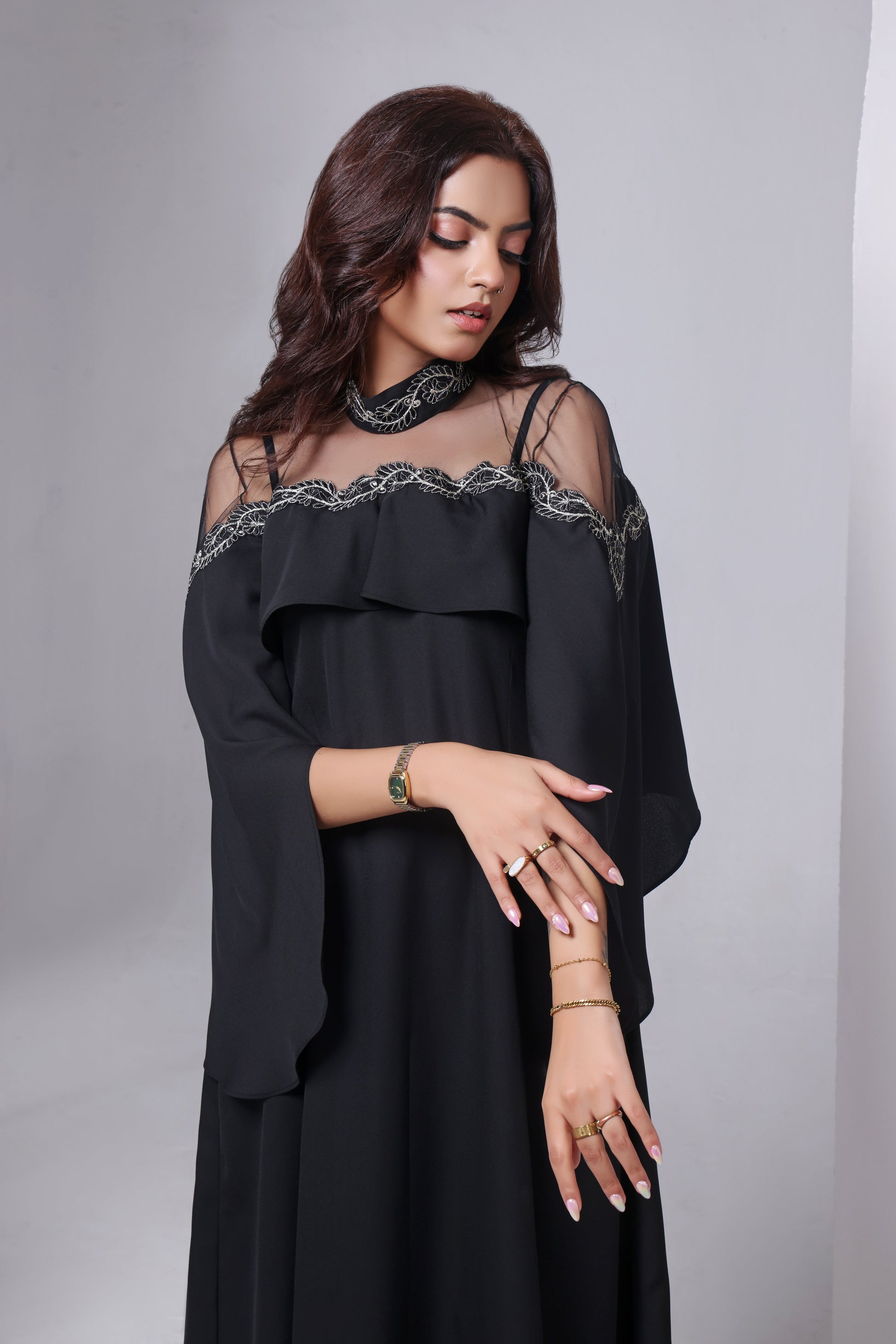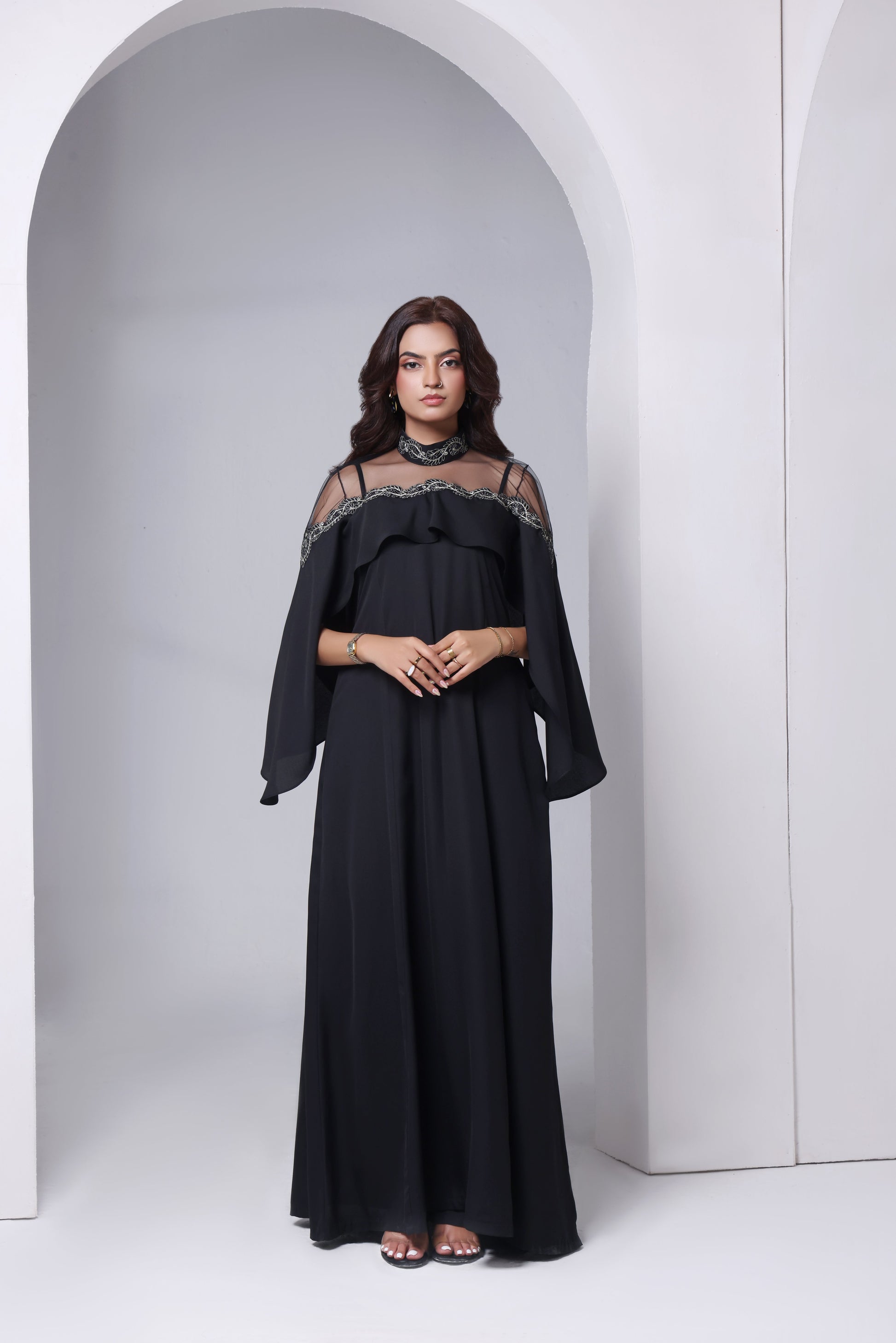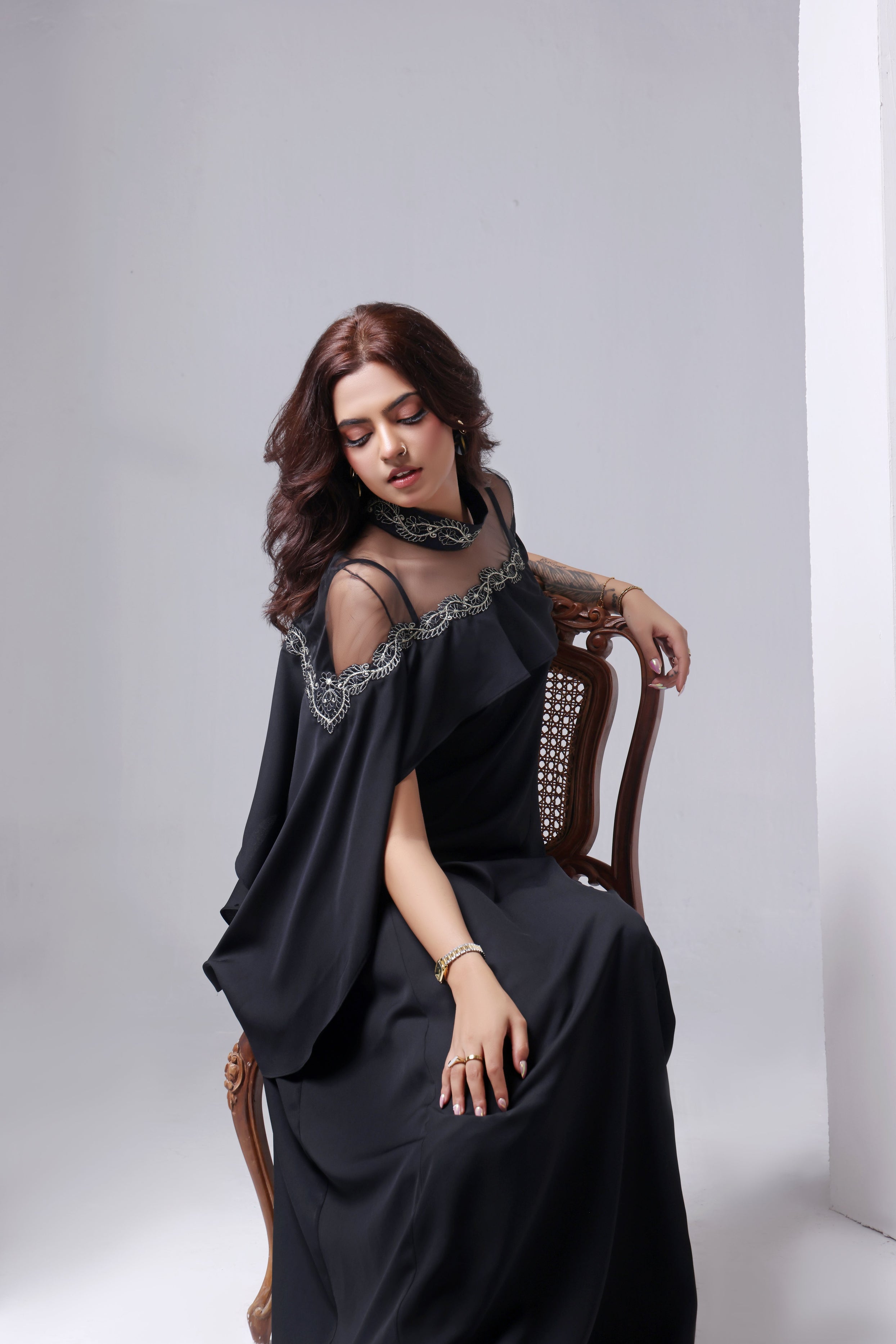A minimalist black A-line dress with a sleek mock neck provides a powerful foundation. From its shoulder flows a dramatic sheer cape transformed into a master piece with elaborate gold zari work.