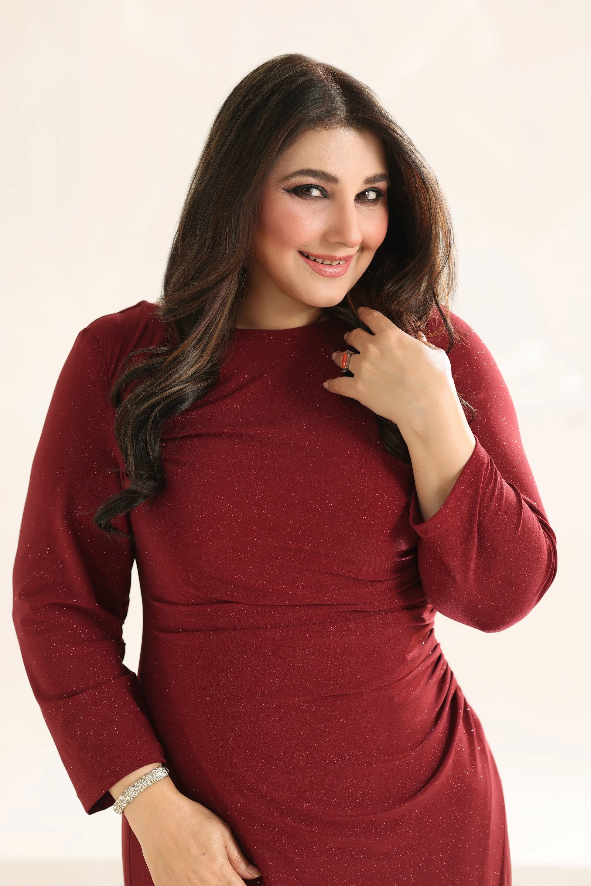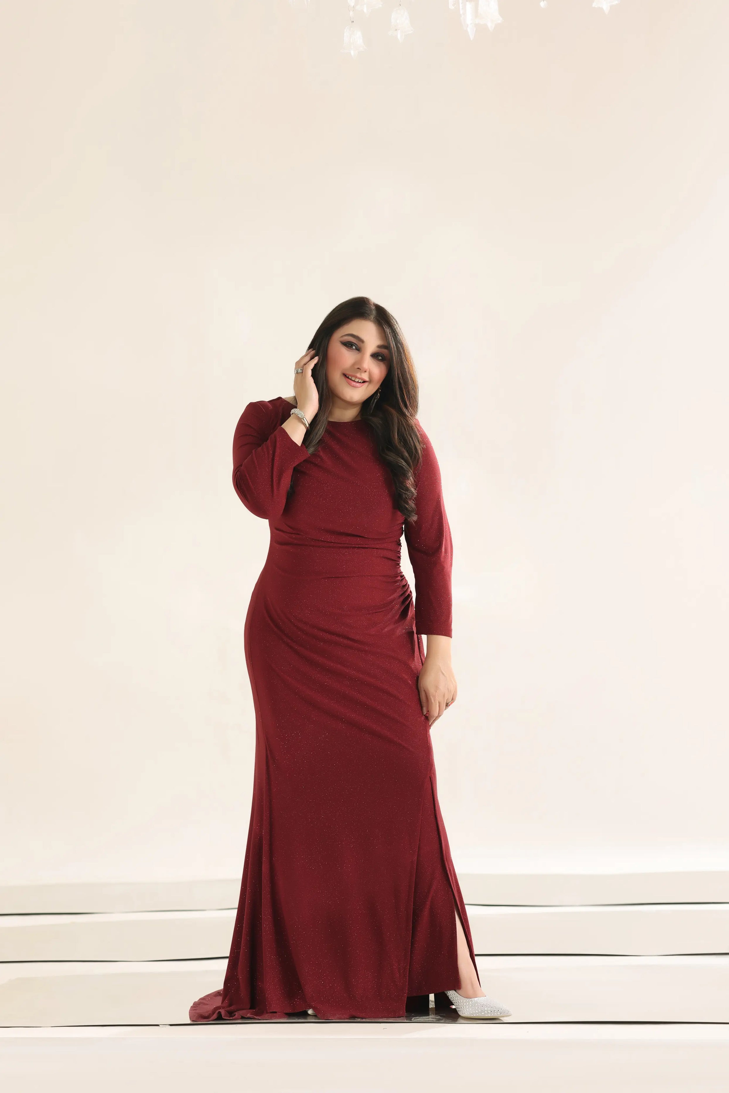 Fitted, full-length gown with long sleeves and a subtle sparkle/shimmer fabric. The dress has a sleek silhouette with a slit on the side and appears to have a glossy or metallic sheen.