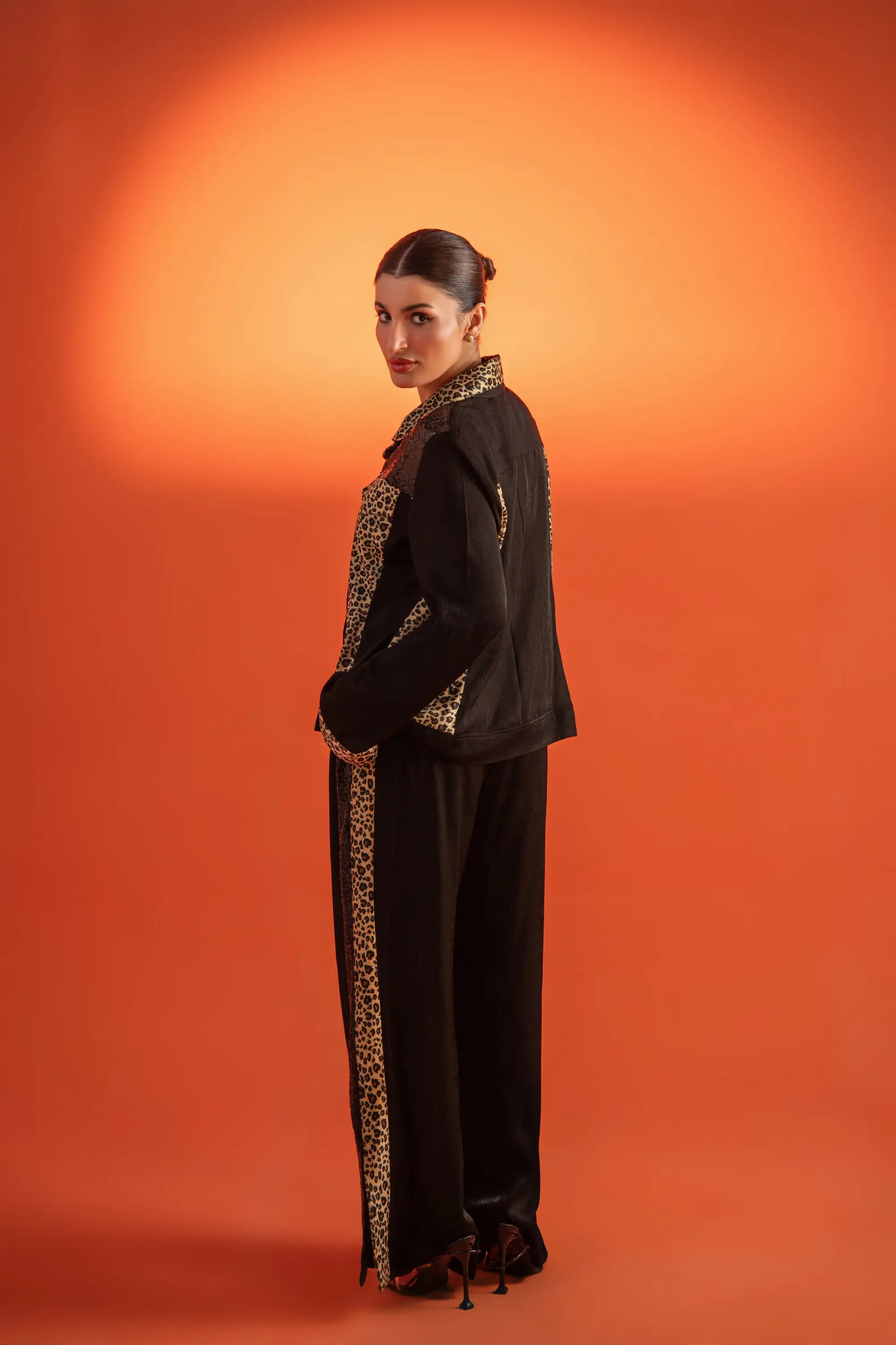A statement Co-ord Set where bold leopard print meets delicate texture. Vertical leopard panels and solid black fabric are united by a sheer lace yoke, creating a piece that transitions effortlessly from polished daywear to an edgy evening look. Slip is not included.