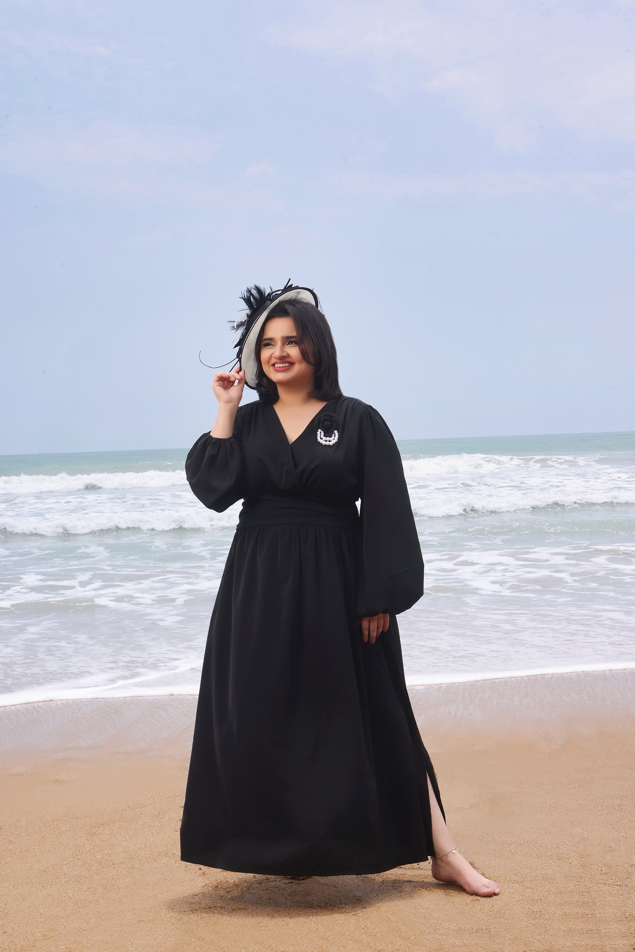 Embrace timeless drama in Gala Slit Dress.' This elegant dress, crafted from flowy, lightweight georgette, features a flattering V-neckline, long sleeves, and a cinched waist that leads to a chic side slit.