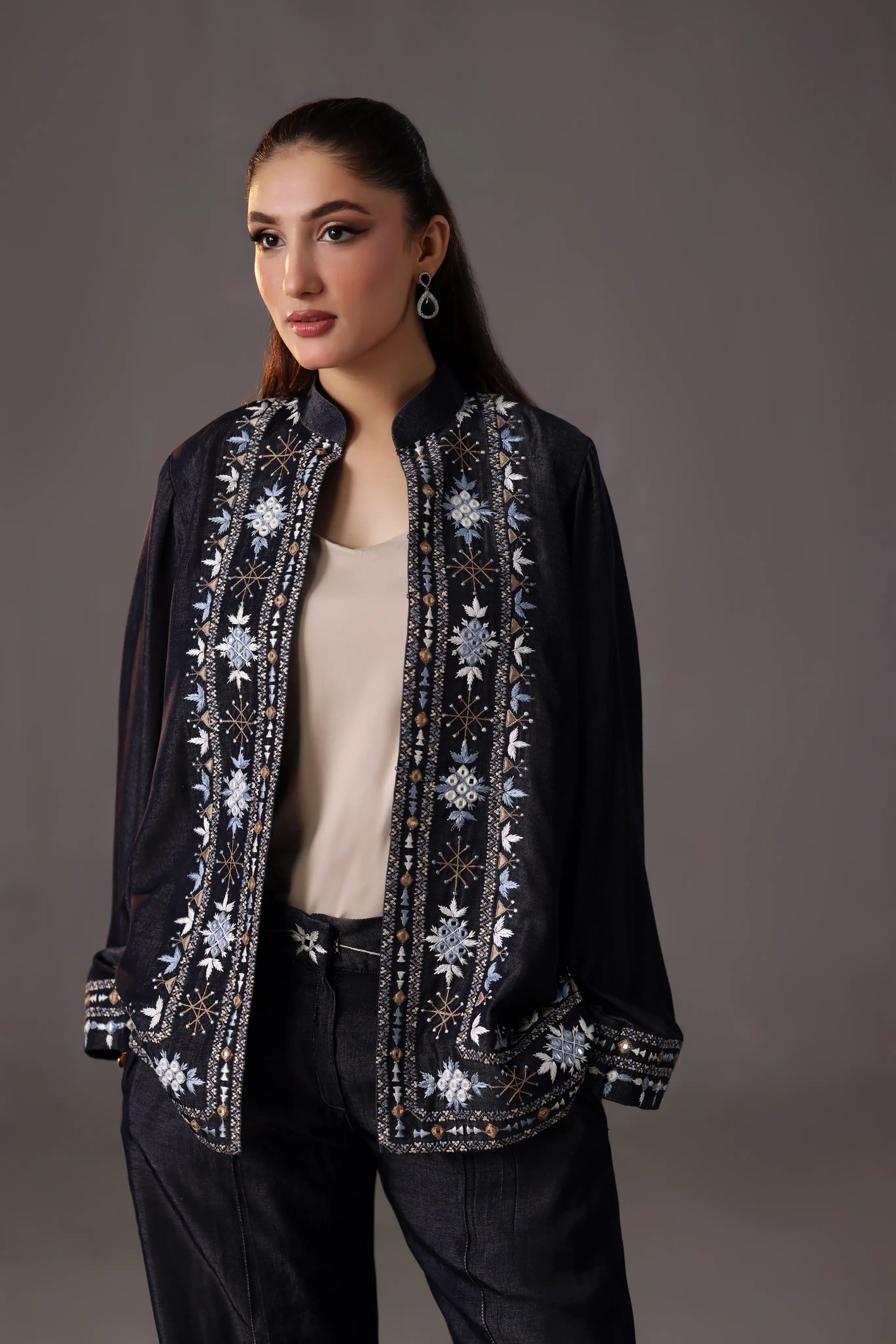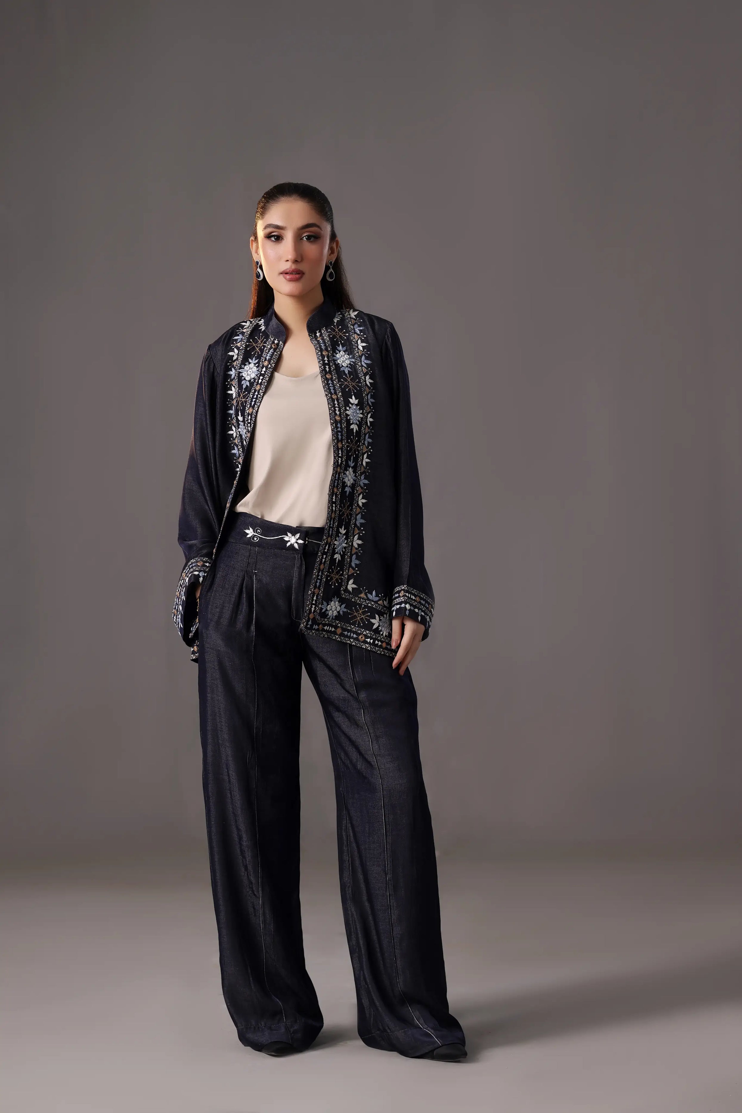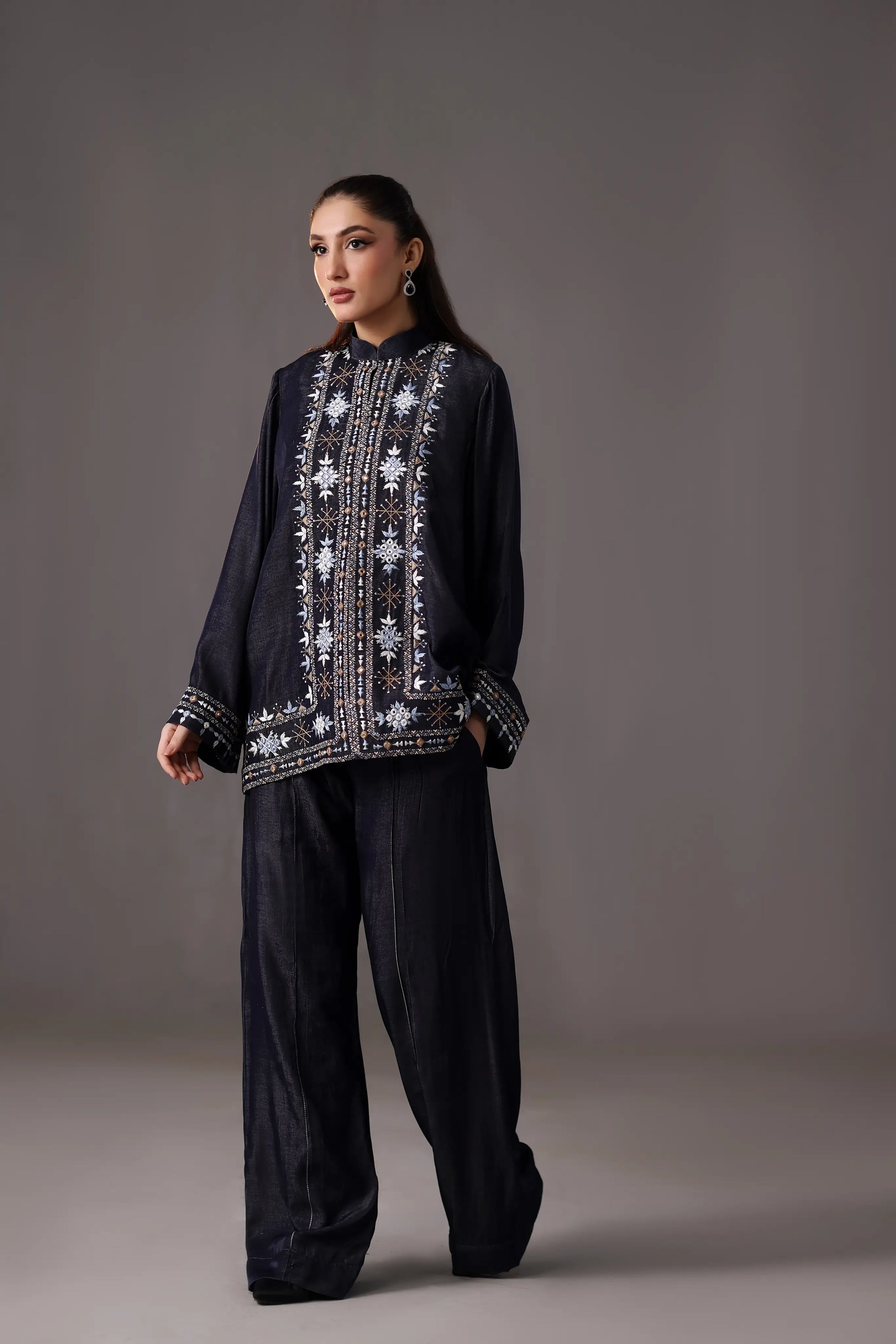 A sleek two piece set in deep indigo blue, featuring intricate floral and geometric embroidery in light blue, cream, and bronze. The band-collar kurta and tailored high waist trousers are elegantly detailed for a fresh take on tradition, ideal for festive or semiformal wear.